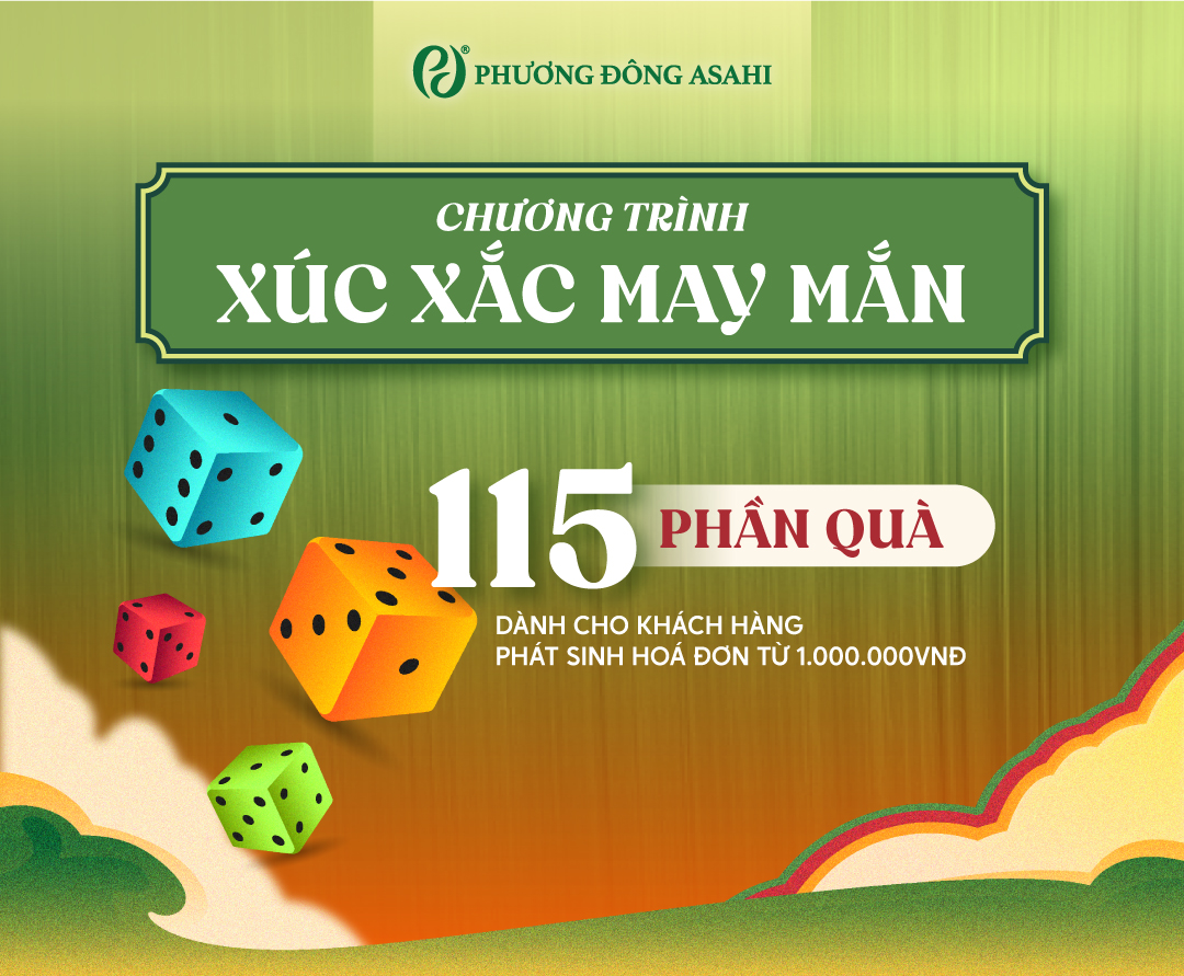 Đặc biệt: Chương trình “Xúc xắc may mắn” với 115 phần quà (túi chườm thảo dược, yến sào, Sâm Ngọc Linh, trống lúc lắc, ba lo dây rút, gối chữ U) dành riêng cho khách hàng phát sinh hoá đơn từ 1.000.000đ tại Phương Đông Asahi.