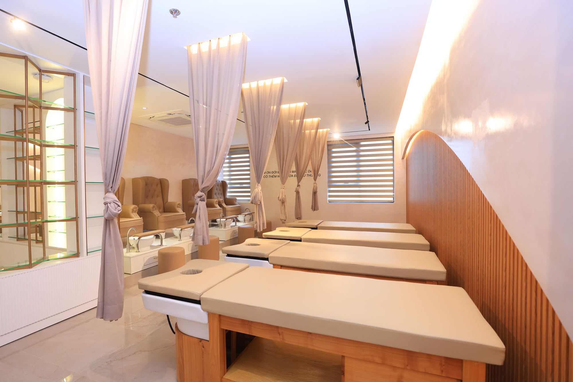 Tiếp nối hành trình trải nghiệm là phòng chăm sóc sắc đẹp như một salon thu nhỏ, mang phong cách hiện đại, tối giản. Hệ thống gương, bàn trang điểm, ghế, giường, kệ mỹ phẩm... cùng ánh sáng và nội thất được sắp đặt tinh tế, thể hiện sự tôn trọng với sứ mệnh nâng niu nét đẹp tuổi già.